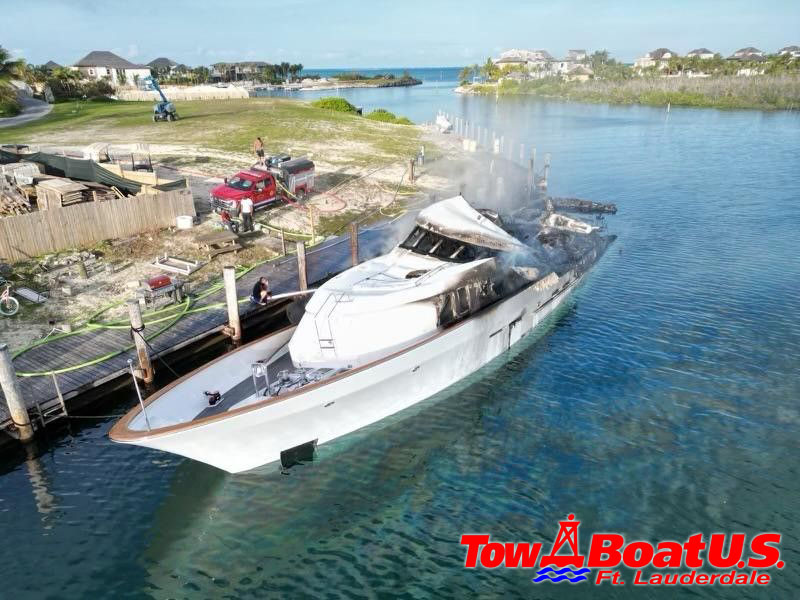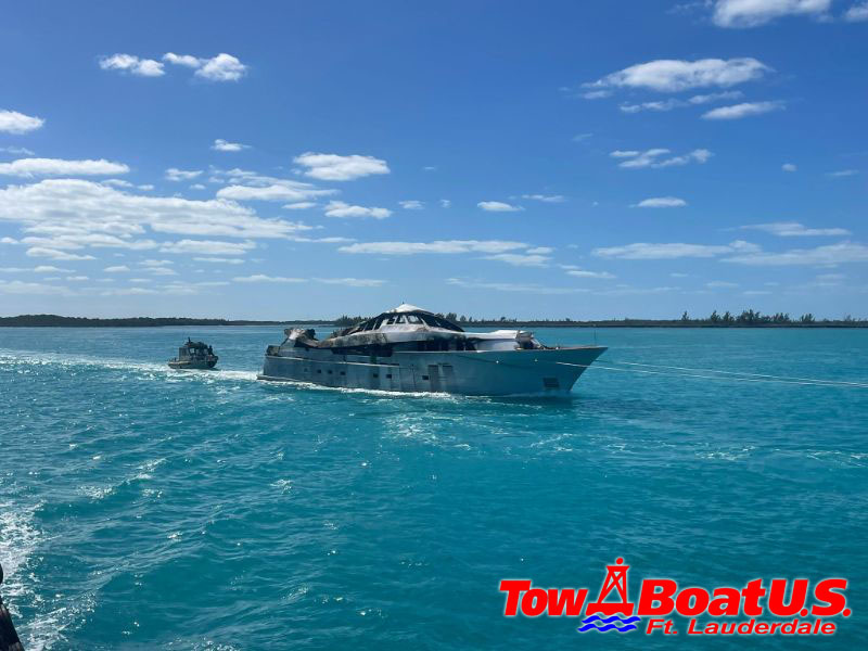 A 124' Delta yacht caught fire and sank in the Bahamas. TowBoatU.S. Fort Lauderdale was contracted to perform the recovery, deploying a salvage team aboard their 96' salvage vessel, the Richard L. Becker, and the 55' Lady Katherine. Upon arrival, salvage divers assessed the condition of the vessel, rigged lift bags, and constructed cofferdams to prepare the vessel for refloating. As lift bags were inflated, the team deployed five diesel-powered high-capacity dewatering pumps to remove water from the vessel. The Delta was then towed approximately 200 miles back to the U.S., where it was hauled out and preserved for fire investigation and inspection.